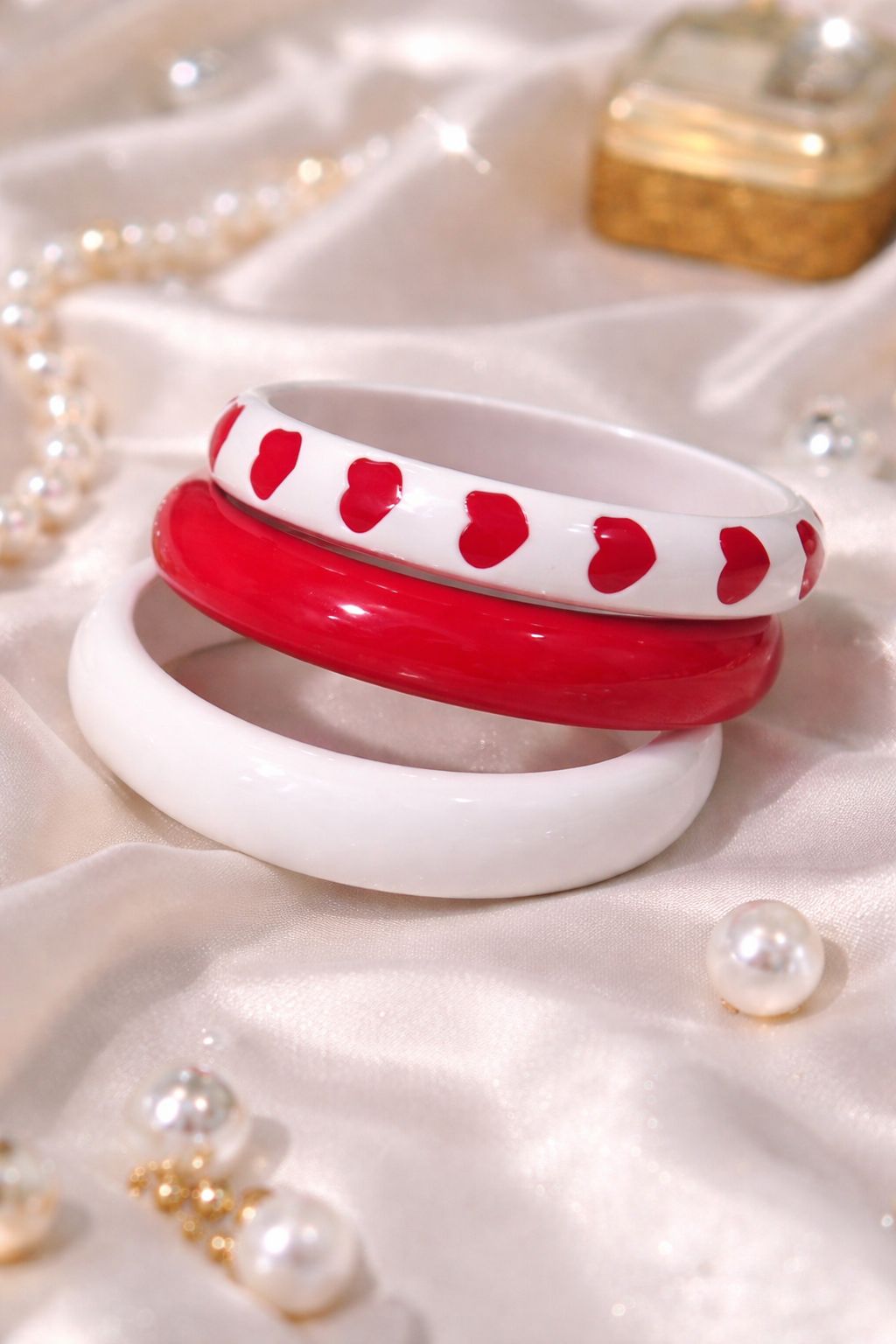 The Laila Love Stack is a sweet celebration of romance and charm, designed for the girl who wears her heart with confidence. Featuring glossy white and bold red bangles accented with delicate heart motifs, this stack radiates playful elegance and timeless femininity. The smooth finish and vibrant contrast create a striking yet graceful look that instantly brightens any outfit. Whether styled for a brunch date, festive gathering, or everyday glam, the Laila Love Stack adds a touch of love, warmth, and statement energy to your wrist.