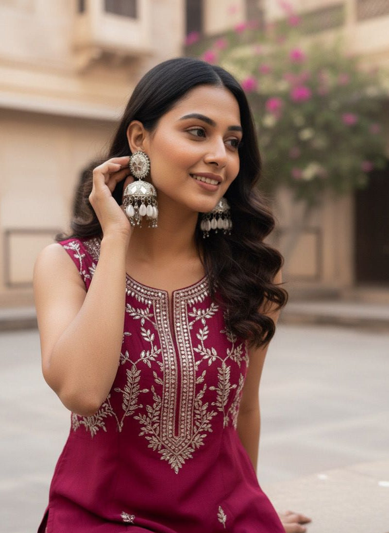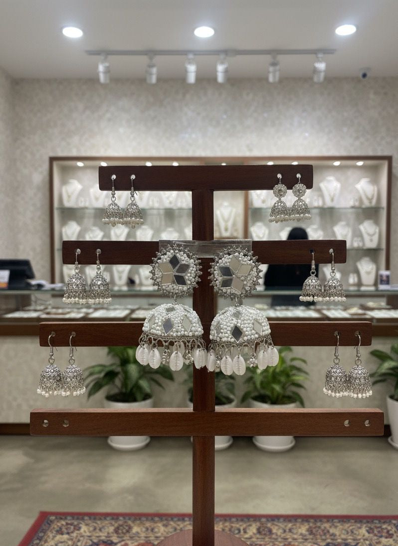 Pure elegance handcrafted in white. Featuring pearl-like bead embroidery and hand-cut mirrors on a dome-shaped base, these white jhumkas are perfect for brides, bridesmaids, and lovers of soft, minimal aesthetics. They brighten your face instantly—like wearing elegance itself.